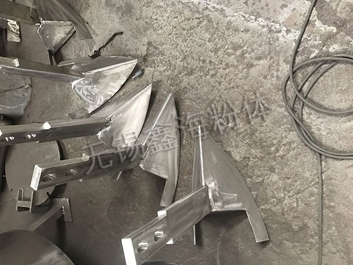 混合機噴液裝置固定在筒體上方,噴嘴采用農(nóng)用噴頭,噴散效果好。