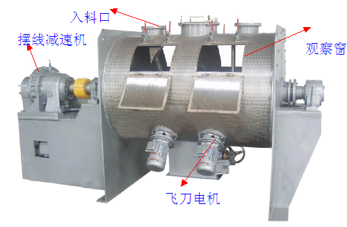 它主要是由傳動部分,臥式筒體、犁刀組軸、飛刀組、出料閥、噴液裝置等組成。